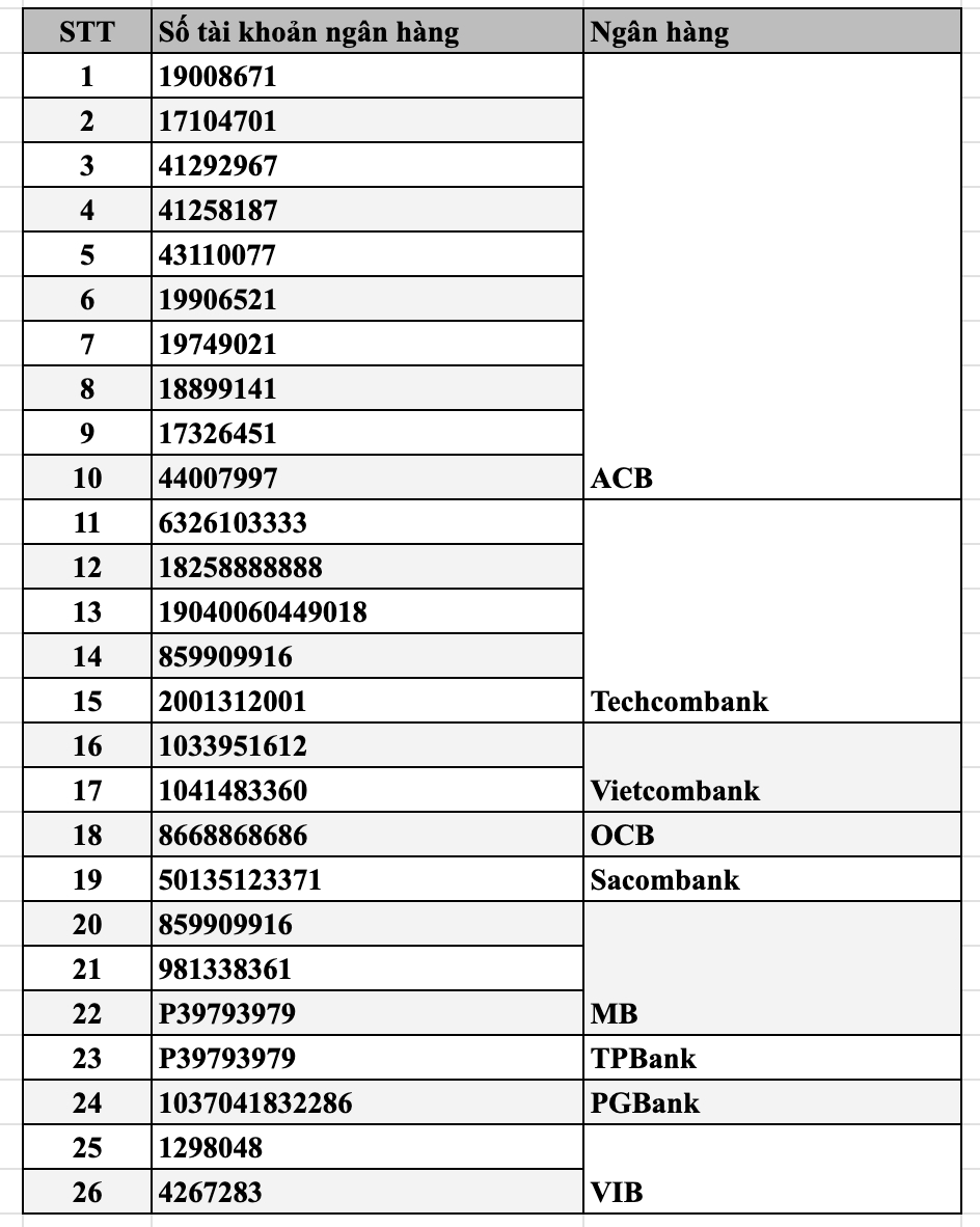 Danh sách gồm 25 số tài khoản ngân hàng lừa đảo. (Nguồn: Cổng thông tin điện tử Công an tỉnh Thái Bình)