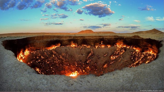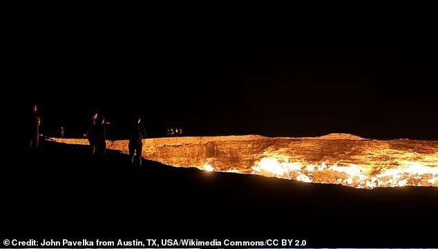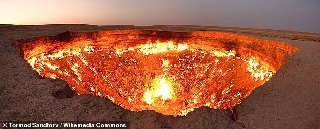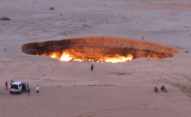 Hố lửa này rộng khoảng 70 mét, được hình thành vào năm 1971 được cho là do sự cố khoan thăm dò khí đốt của các nhà khoa học Liên Xô. Sau khi vô tình khoan trúng túi khí ngầm, họ quyết định đốt cháy nó để ngăn khí độc thoát ra.