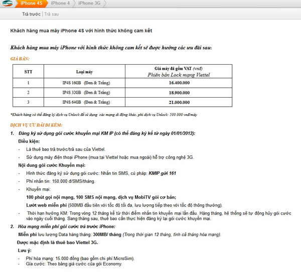 Giá bán bản lock mạng Viettelhình thức trả trước.Ảnh: Trang web Viettel.