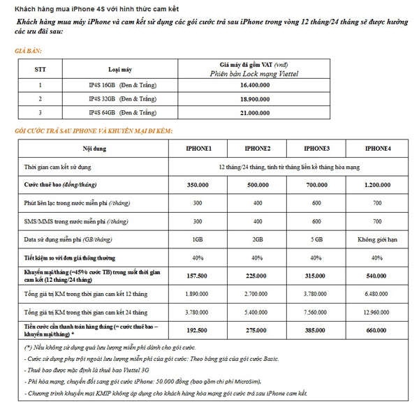Ngày 16/12 tới đâyViettel sẽ chính thức bán ra iPhone 4S tại Việt Nam và hôm nay nhà mạng này đã công bốgiá bán chosmartphone mới của Apple qua 2 hình thức cam kết và không cam kết như với iPhone 4. Theo đó iPhone 4S sẽ có giá từ16,4 triệu cho bản lock và từ17 triệu cho bản quốc tế (thêm phí kích hoạt bảnlock thành bản quốc tế).