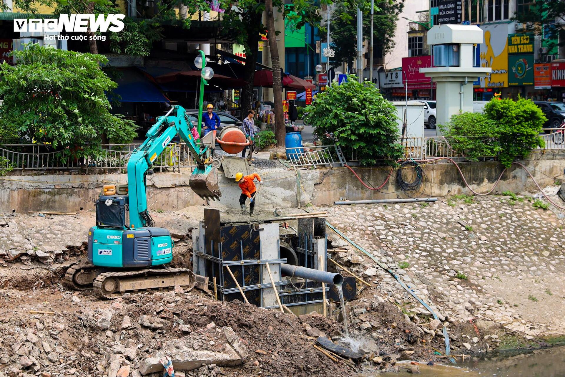 Ghi nhận của PV Báo Điện tử VTC News, tại khu vực cầu Quang, đập dâng đầu tiên của sông Tô Lịch đang dần thành hình sau nhiều tuần thi công khẩn trương. Trong lòng đập, nước đã được hút cạn để làm phần nền móng.