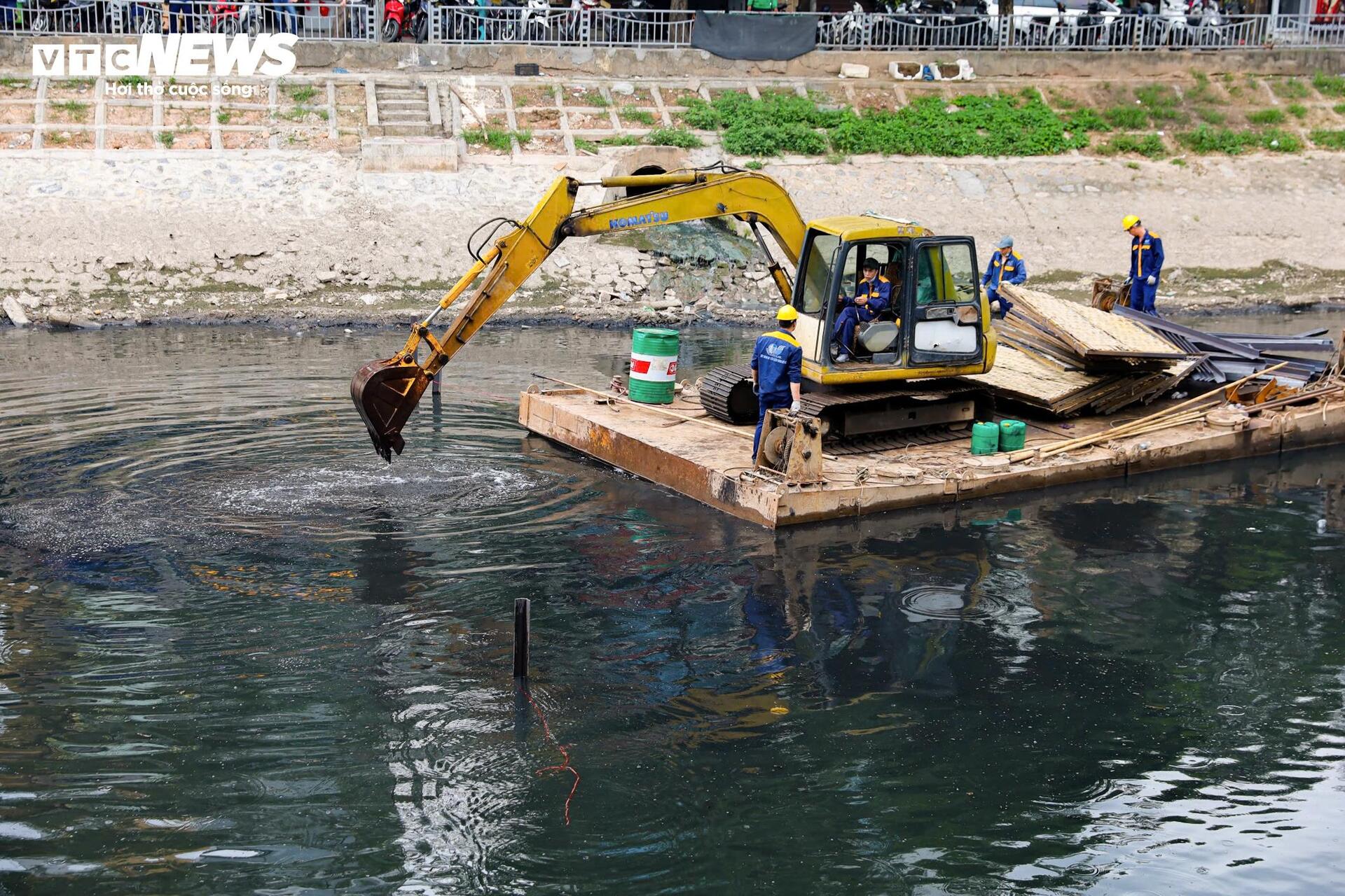 Cùng với việc xây dựng đập dâng, công tác nạo vét bùn thải trên toàn tuyến sông Tô Lịch cũng đang được triển khai mạnh mẽ. Hàng chục công nhân của Công ty TNHH MTV Thoát nước Hà Nội túc trực tại lòng sông để vận hành thiết bị hút bùn cả ngày lẫn đêm.