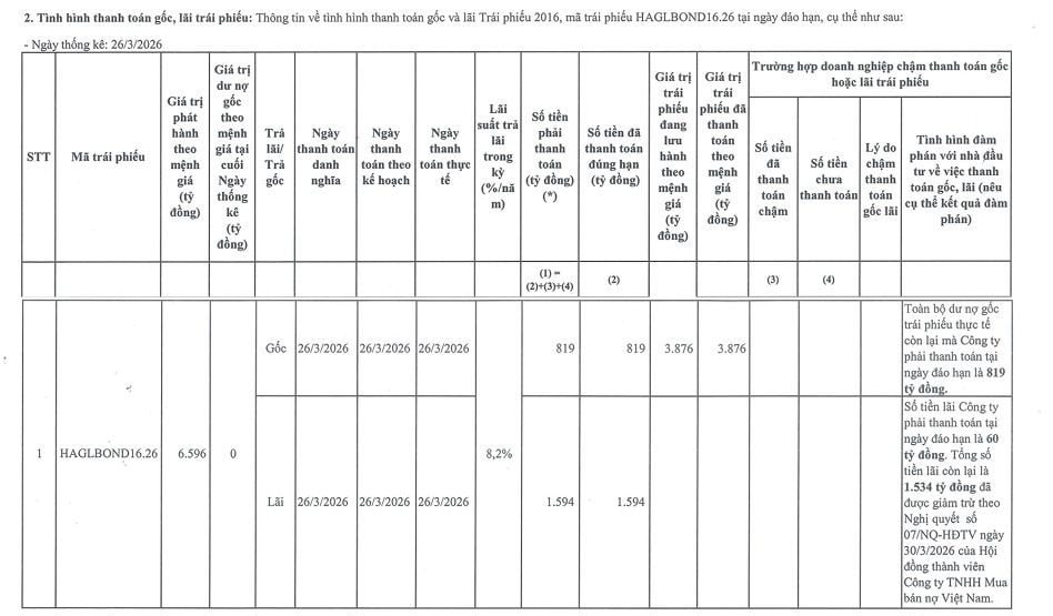 Công ty Cổ phần Hoàng Anh Gia Lai (HAGL) vừa công bố tình hình thanh toán lô trái phiếu HAGLBOND16.26 đến hạn ngày 26/3/2026 với những thay đổi đáng kể trong nghĩa vụ tài chính.