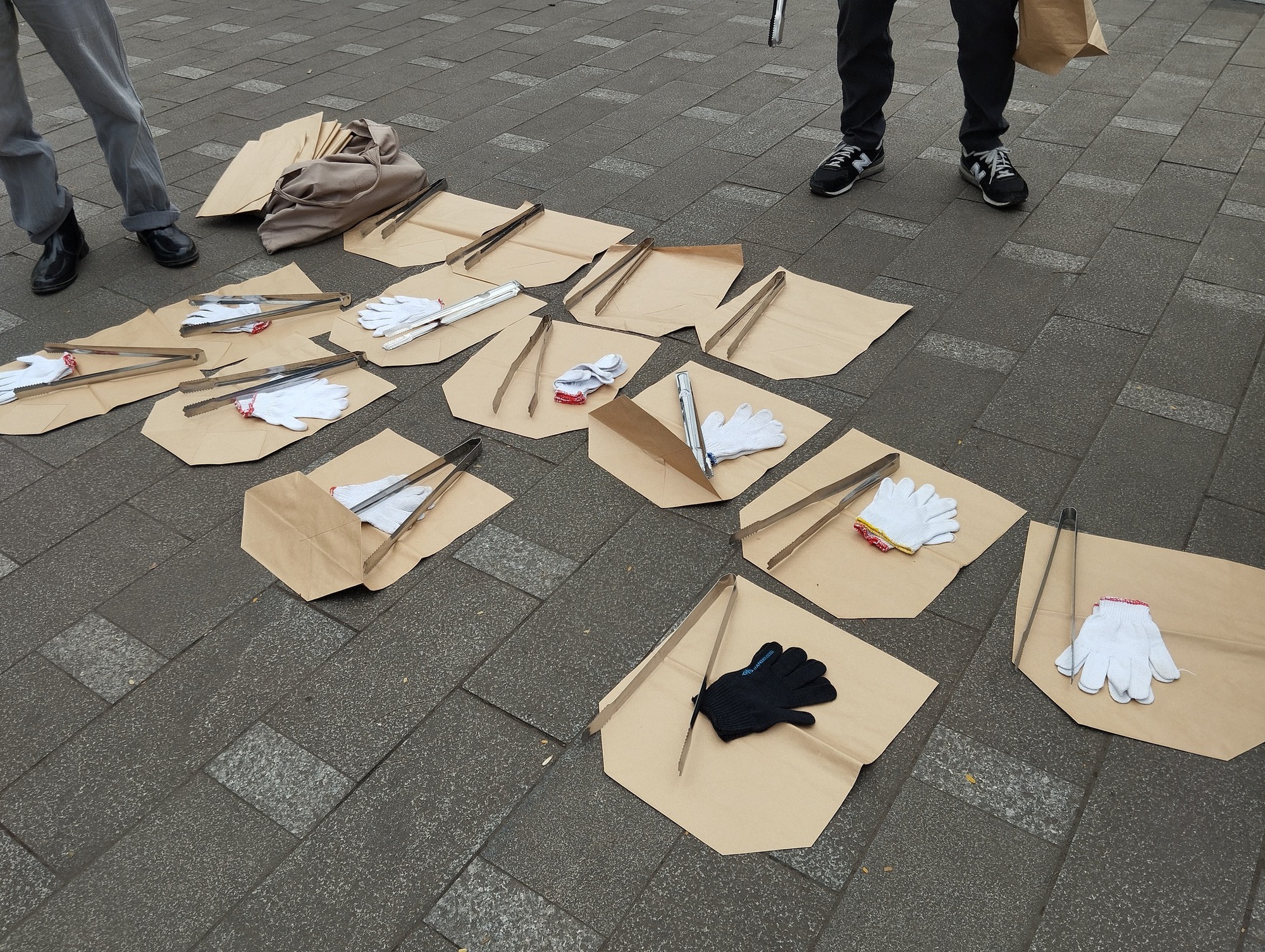 Ở một góc hồ, bà lặng lẽ phân chia túi giấy, găng tay, kẹp sắt... Tất cả dụng cụ được đặt ngay ngắn dưới mặt đất, để bất kỳ người dân, tình nguyện viên có thể đến nhận. Dù không quen biết, họ sẽ đồng loạt tản đi khắp hồ Gươm nhặt rác ở các bụi cây, ven đường, dưới những chiếc ghế đá... trong 30 phút.