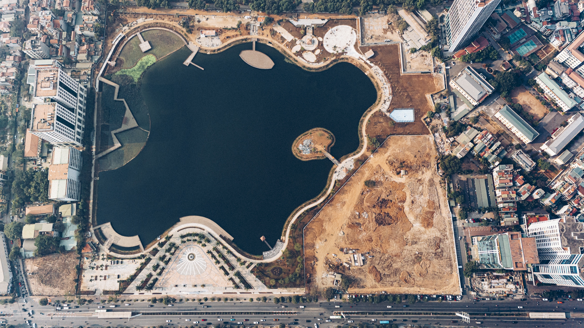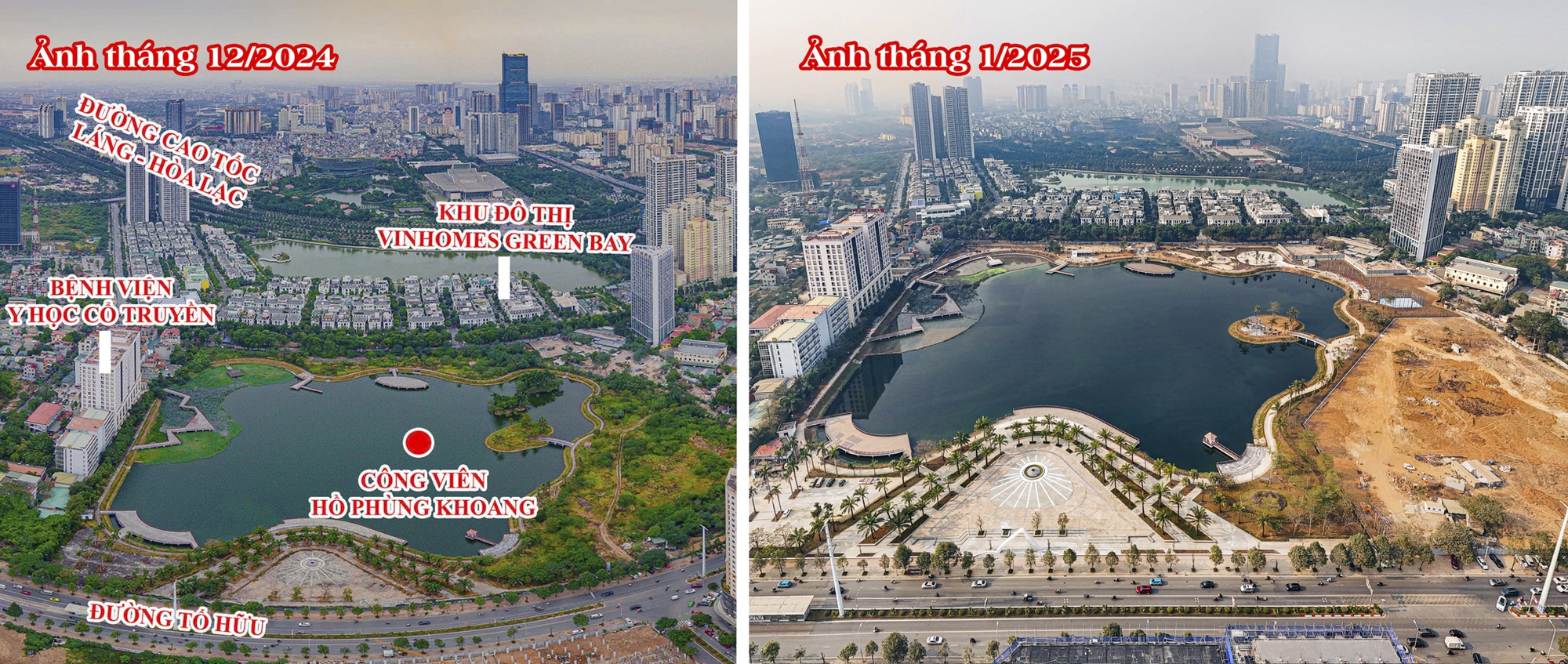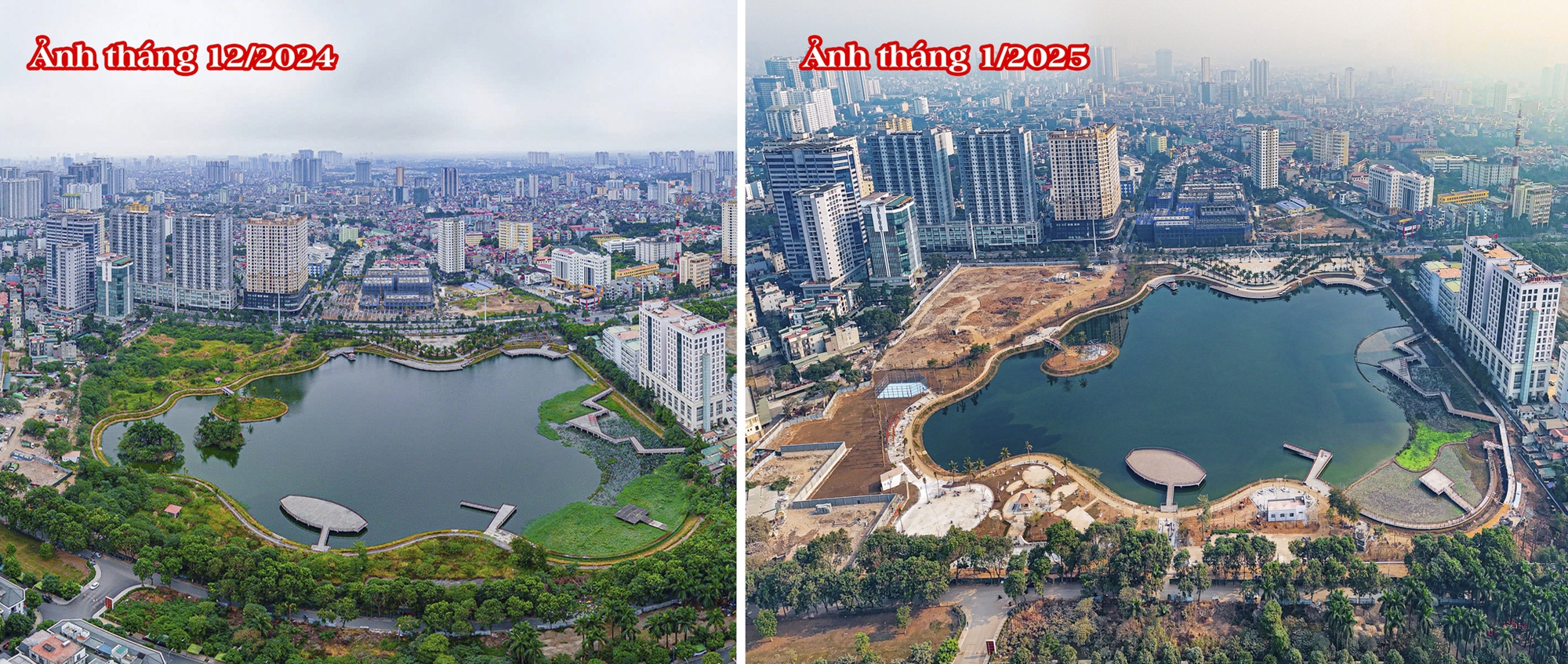 Sau khoảng 8 năm chậm tiến độ, đến nay công viên hồ Phùng Khoang đang được đẩy mạnh thi công. Ảnh chụp vào tháng 12 và hiện tại.
