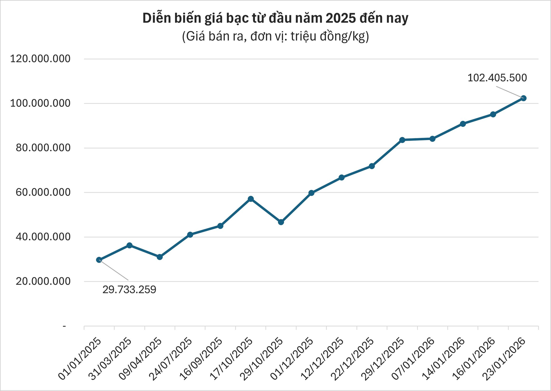 Tính đến ngày 23/01/2026, giá bạc bán ra đã chính thức chạm mốc 102.405.500 đồng/kg. Như vậy, chỉ sau hơn một năm, giá bạc đã đạt mức tăng trưởng xấp xỉ 244,4% . Đây là một con số sinh lời vượt xa vàng và các kênh đầu tư truyền thống khác trong cùng giai đoạn.