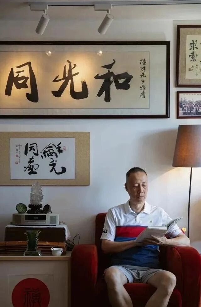 Phần khiến nhiều người ấn tượng nhất là cách ông trang trí phòng khách. Trên tường treo những tác phẩm thư pháp do ông viết trong nhiều năm. Nổi bật ở giữa là bức chữ mang ý nghĩa sống hòa hợp và bình thản. Xung quanh là vài bức tranh mực và một cây đàn tỳ bà treo trang trí. Không gian toát lên vẻ trầm tĩnh và giàu tính văn hóa. Phía dưới là hai chiếc ghế bọc vải đỏ, ở giữa là bàn trà nhỏ. Trên tủ đặt ấm trà và chén, cạnh đó là đèn đứng tạo ánh sáng ấm. Mọi thứ giản dị nhưng mang lại cảm giác thư thái.