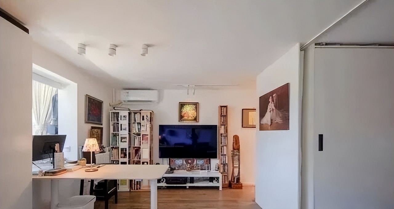 Không gian phòng khách, phòng ăn và góc làm việc được kết nối thành một khu vực chung. Nơi gần cửa sổ có ánh sáng tốt được ông biến thành góc đọc sách. Ông đặt một giá sách xoay, chứa hàng trăm cuốn sách. Chỉ cần xoay nhẹ là có thể lấy cuốn mình cần. Bên cạnh là bàn nhỏ và ghế cao, tạo thành nơi đọc sách yên tĩnh.