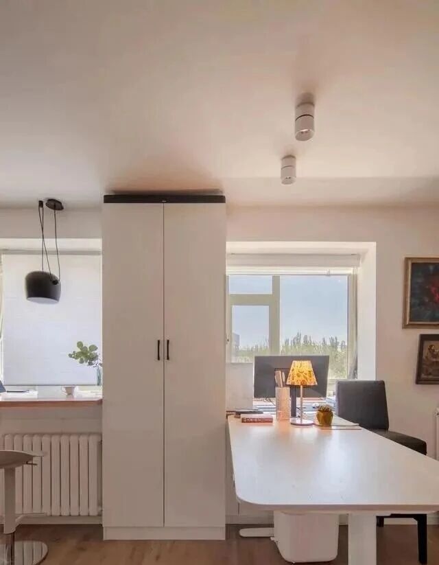 Ngay lối vào, ông lắp một tủ hai mặt vừa để chứa đồ vừa phân chia khu vực. Thiết kế này giúp ngăn cách nhẹ nhàng giữa cửa ra vào và phòng khách mà vẫn giữ được sự thông thoáng. Giữa phòng khách và phòng ngủ, ông cũng mở rộng vách tường và bố trí một quầy nhỏ kết hợp bàn làm việc. Không gian được phân chia hợp lý nhưng không hề tạo cảm giác chật chội.