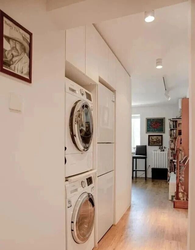 Ở hành lang bên phải, ông tận dụng chiều cao để thiết kế hệ tủ âm tường. Máy giặt, máy sấy và tủ lạnh được đặt gọn trong tủ, vừa ngăn nắp vừa tiện sử dụng. Nhờ cách sắp xếp này, căn nhà nhỏ vẫn đầy đủ tiện nghi mà không bị rối mắt.