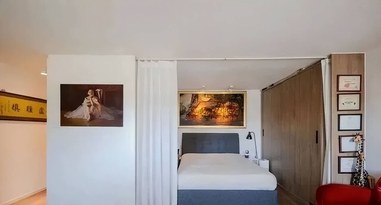 Bên cạnh khu vực này, ông tận dụng tủ hai mặt để ngăn ra một góc ngủ. Chỉ cần đặt một chiếc giường đôi là đủ. Phía trước giường có thanh treo rèm. Khi nghỉ ngơi hoặc có khách đến, ông kéo rèm để đảm bảo riêng tư. Giải pháp này giúp không gian linh hoạt và vẫn giữ được sự ấm cúng.