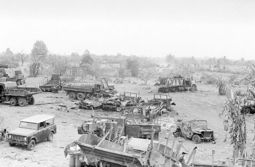 Xe quân sự của quân đội VNCH bị phá huỷ trong cuộc rút lui trên Đường số 7. (Ảnh: Tư liệu)