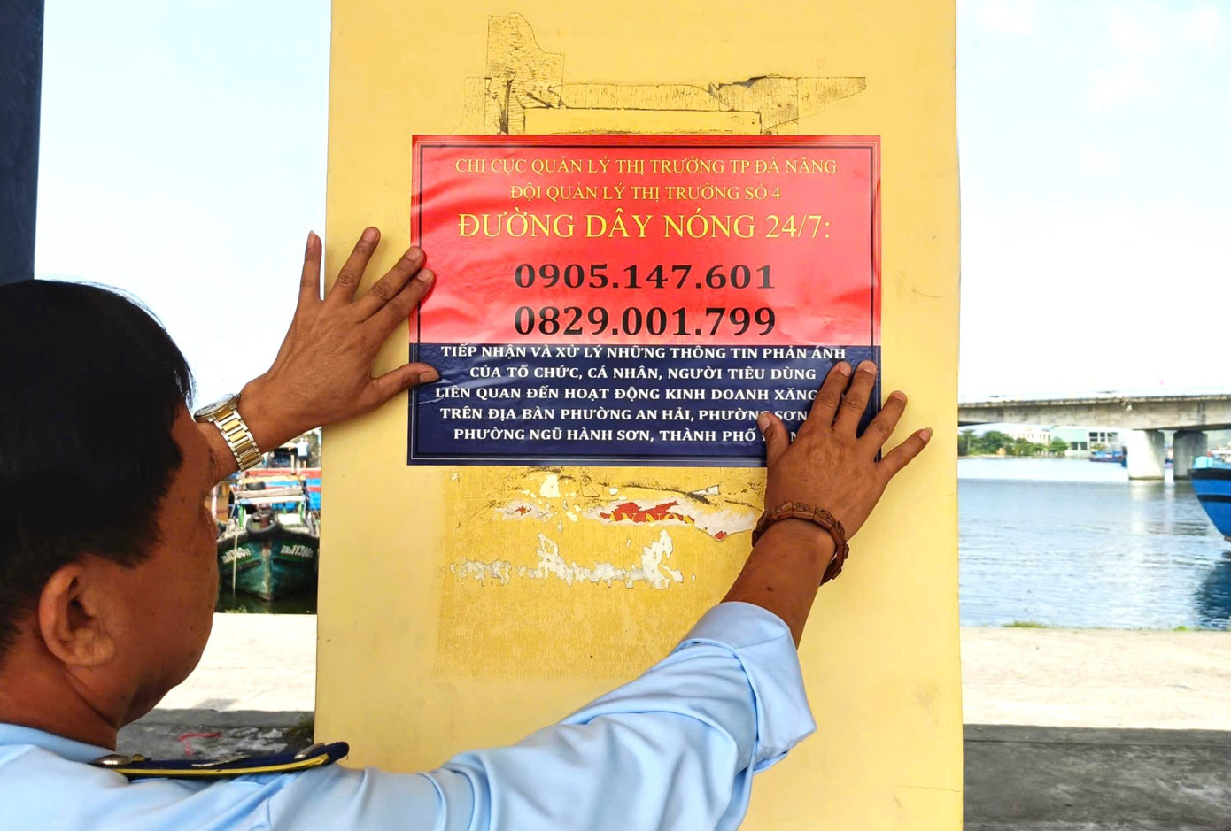 Số điện thoại đường dây nóng được dán ở tất cả các cửa hàng xăng dầu tại Đà Nẵng.