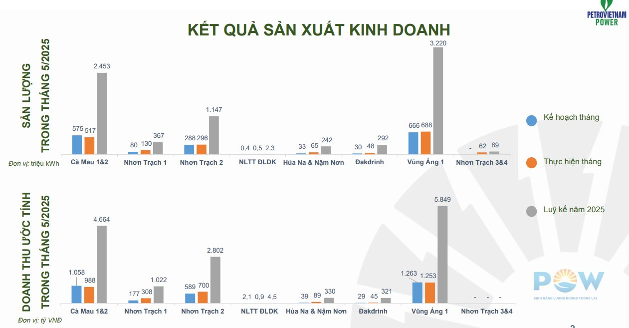 Theo đó, tổng sản lượng điện của các nhà máy điện (NMĐ) của PV Power ước đạt khoảng 1.807 triệu kWh và doanh thu bán điện ước đạt 3.384 tỷ đồng trong tháng 5. Trong đó, đóng góp chính bởi NMĐ Vũng Áng 1 đem lại gần 1.243 tỷ đồng và NMĐ Cà Mau 1&2 mang về 976 tỷ đồng, chiếm tổng cộng gần 67% doanh thu.