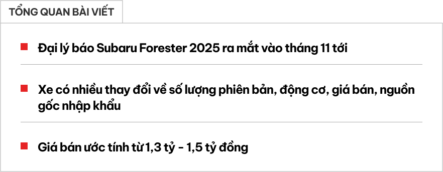 Đại lý báo Subaru Forester 2025 ra mắt Việt Nam ngay tháng 11: Động cơ mới, nhập Nhật, giá cao nhất 1,5 tỷ