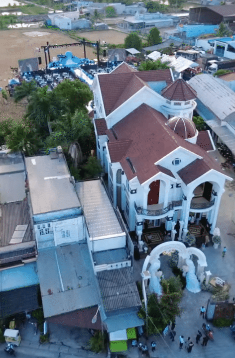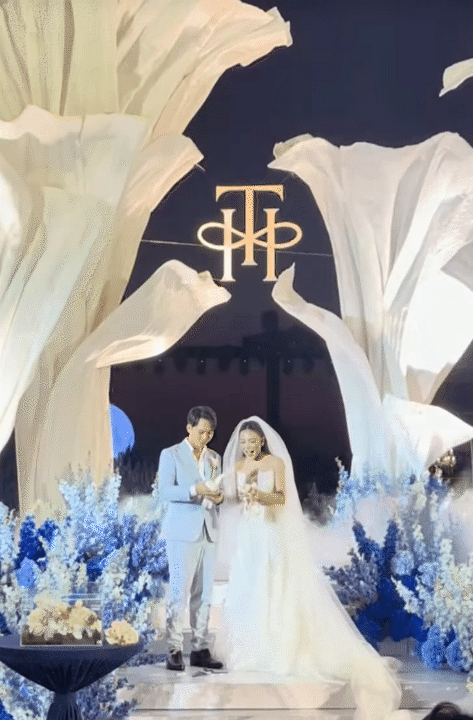 Sự hoành tráng của đám cưới tiếp tục được khẳng định khi những khung hình về dinh thự nhà trai được hé lộ. Cơ ngơi khoác lên mình lớp áo trắng hiện đại, sang trọng với khuôn viên siêu rộng tích hợp cả bể bơi. Chính tại khuôn viên này, một sân khấu khổng lồ đã được dựng lên làm lễ đường cho cặp đôi, đủ sức chứa quy mô tiệc lên tới 110 bàn.