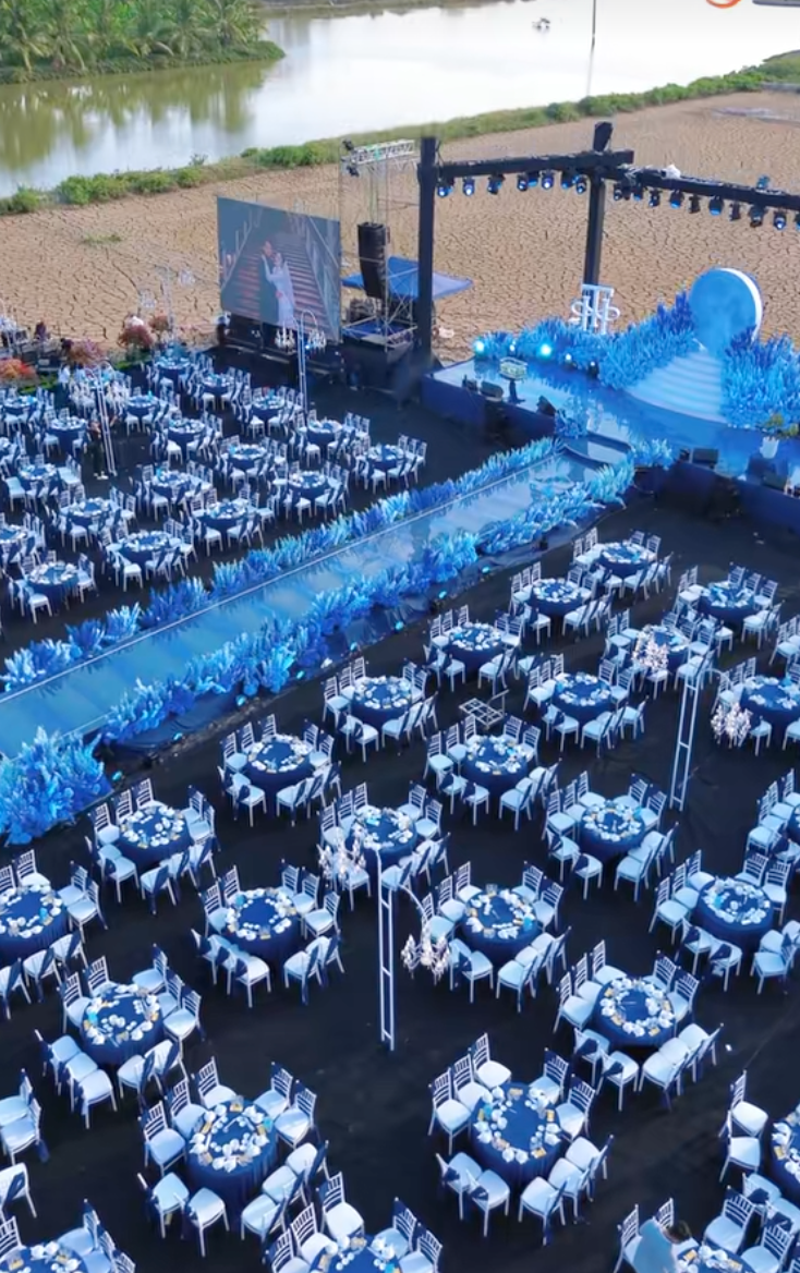Một điểm vô cùng tinh tế là tiệc cưới không dùng hoa tươi mà sử dụng hoa lụa cao cấp với tông màu xanh chủ đạo. Sắc xanh này vừa mang lại cảm giác mát mẻ, thanh lịch, vừa ngầm thể hiện niềm tự hào về ngành nghề thủy hải sản mà gia đình chú rể đang kinh doanh.