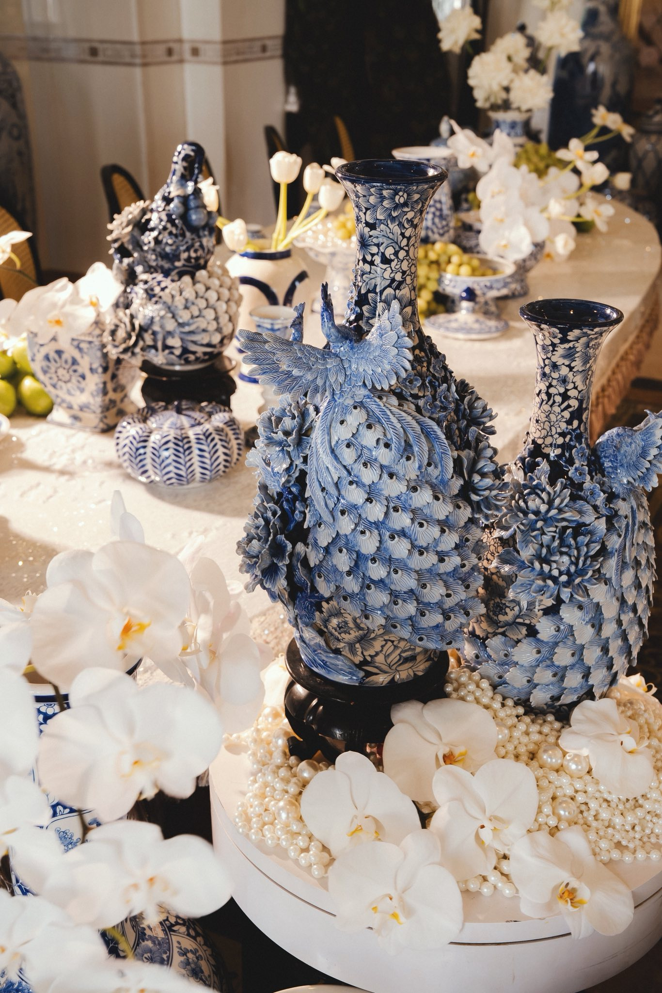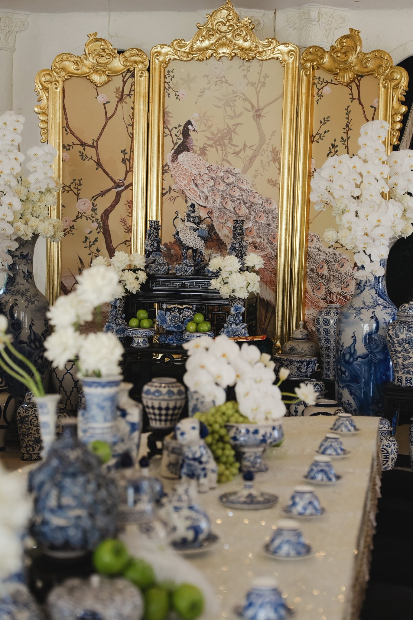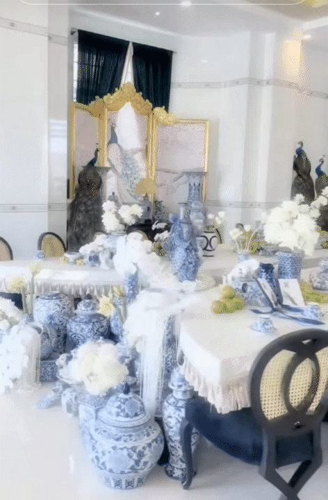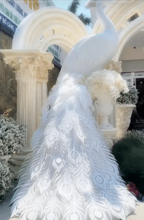 Đặc biệt, nếu cổng cưới Long - Phụng là "đặc sản" quen thuộc trong các đám cưới hào môn, thì đại thiếu gia Bạc Liêu lại chọn một lối đi riêng tinh tế hơn. Cổng hoa và không gian bên trong được tô điểm bằng hình ảnh cặp khổng tước trắng. Loài chim biểu tượng cho sự vương giả, thanh thoát này không chỉ tạo ra sự đồng điệu tuyệt đối với bộ gốm sứ mà còn nâng tầm thẩm mỹ cho toàn bộ không gian.