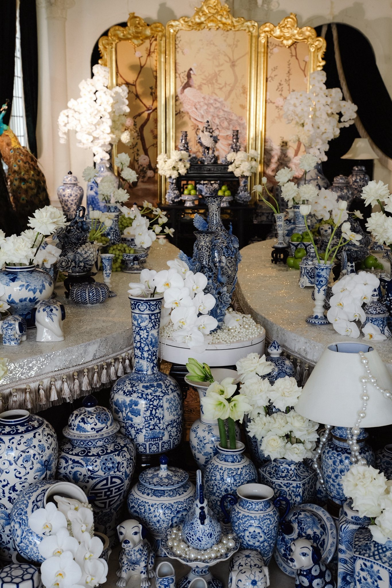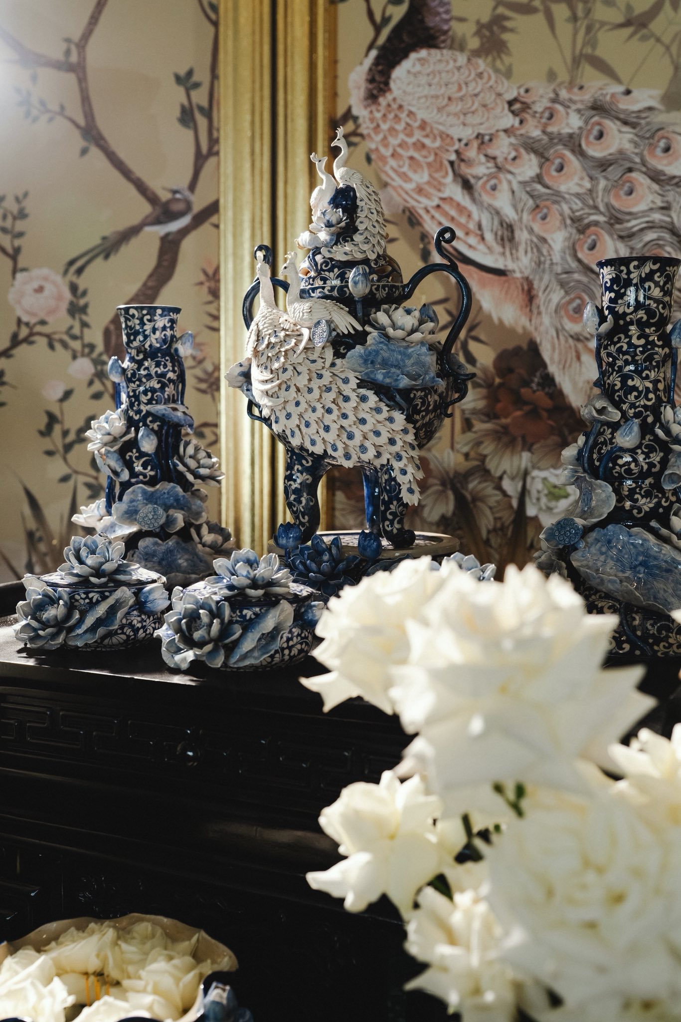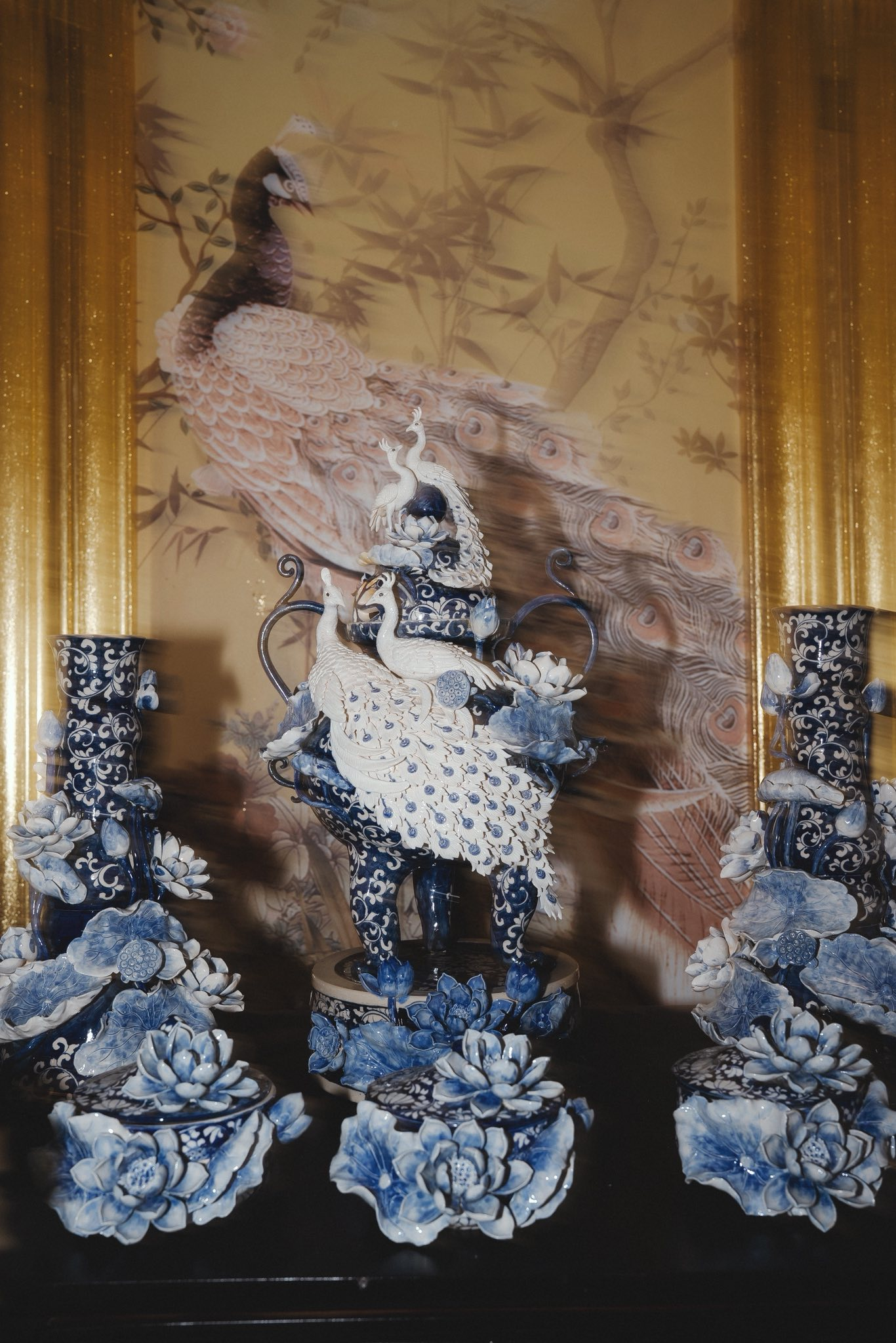 Đặc biệt, nếu cổng cưới Long - Phụng là "đặc sản" quen thuộc trong các đám cưới hào môn, thì đại thiếu gia Bạc Liêu lại chọn một lối đi riêng tinh tế hơn. Cổng hoa và không gian bên trong được tô điểm bằng hình ảnh cặp khổng tước trắng. Loài chim biểu tượng cho sự vương giả, thanh thoát này không chỉ tạo ra sự đồng điệu tuyệt đối với bộ gốm sứ mà còn nâng tầm thẩm mỹ cho toàn bộ không gian.