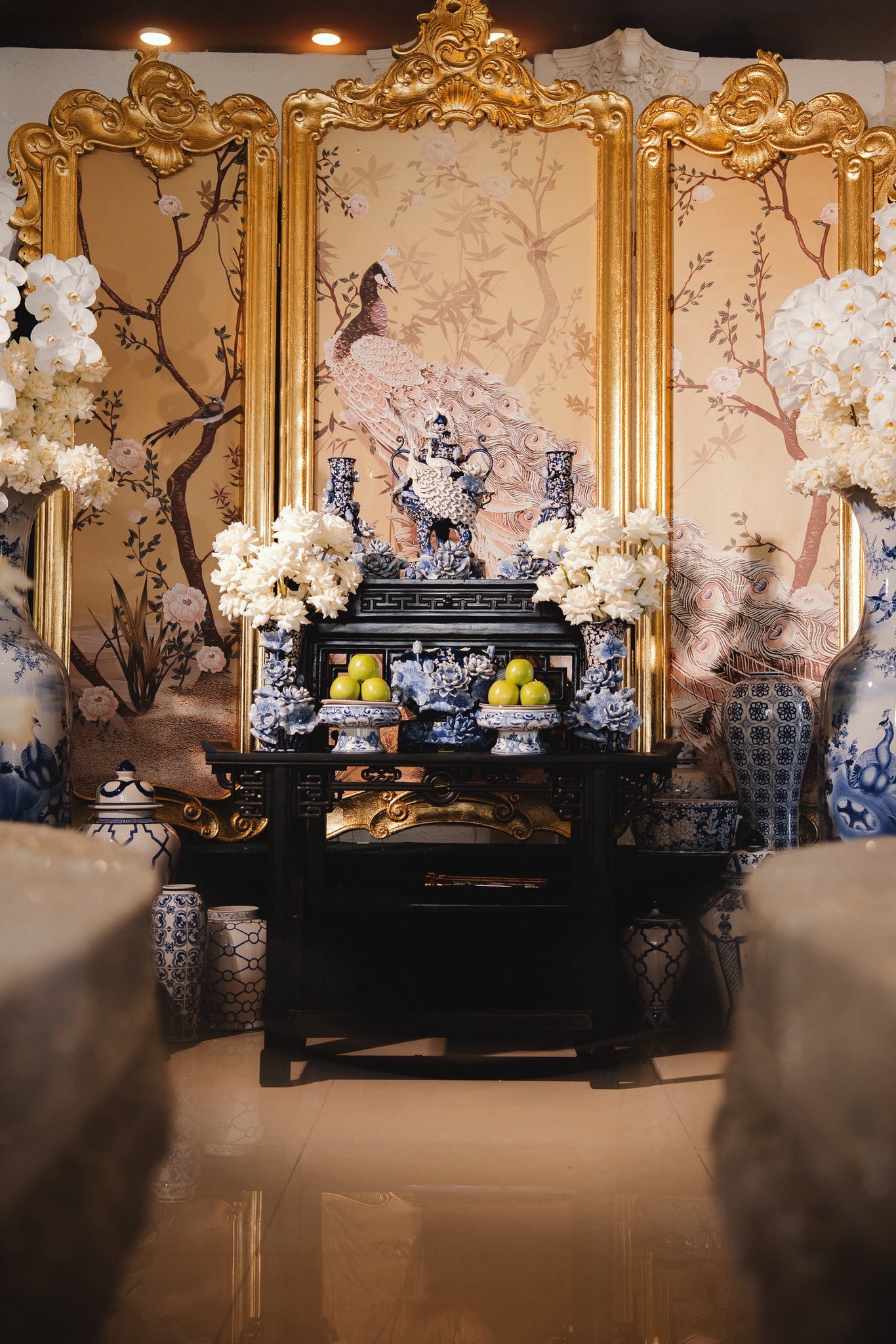 Ngay từ lễ gia tiên, nhà trai đã chứng minh đẳng cấp hào môn khi mạnh tay chi tới 550 triệu đồng chỉ riêng cho hạng mục trang trí lễ gia tiên. Dưới bàn tay trang trí của NTK Lâm Lâm, không gian gia tiên mang chủ đề "Hoàng Lam Hỷ" đã trở thành một tác phẩm nghệ thuật quy mô và tâm huyết bậc nhất.
