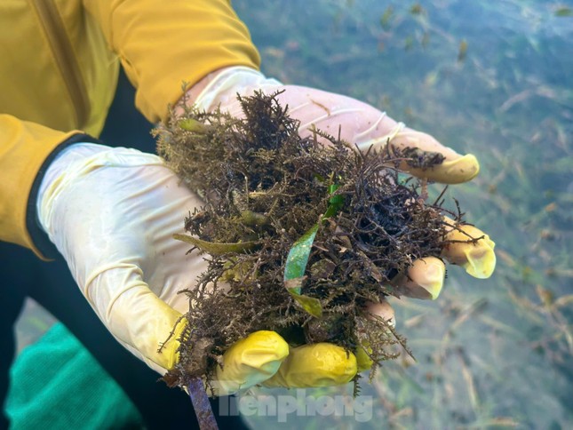Phải thật tinh mắt, biết phân biệt và nhìn kỹ qua mặt nước mới có thể hái được loại rau câu chân vịt tự nhiên.