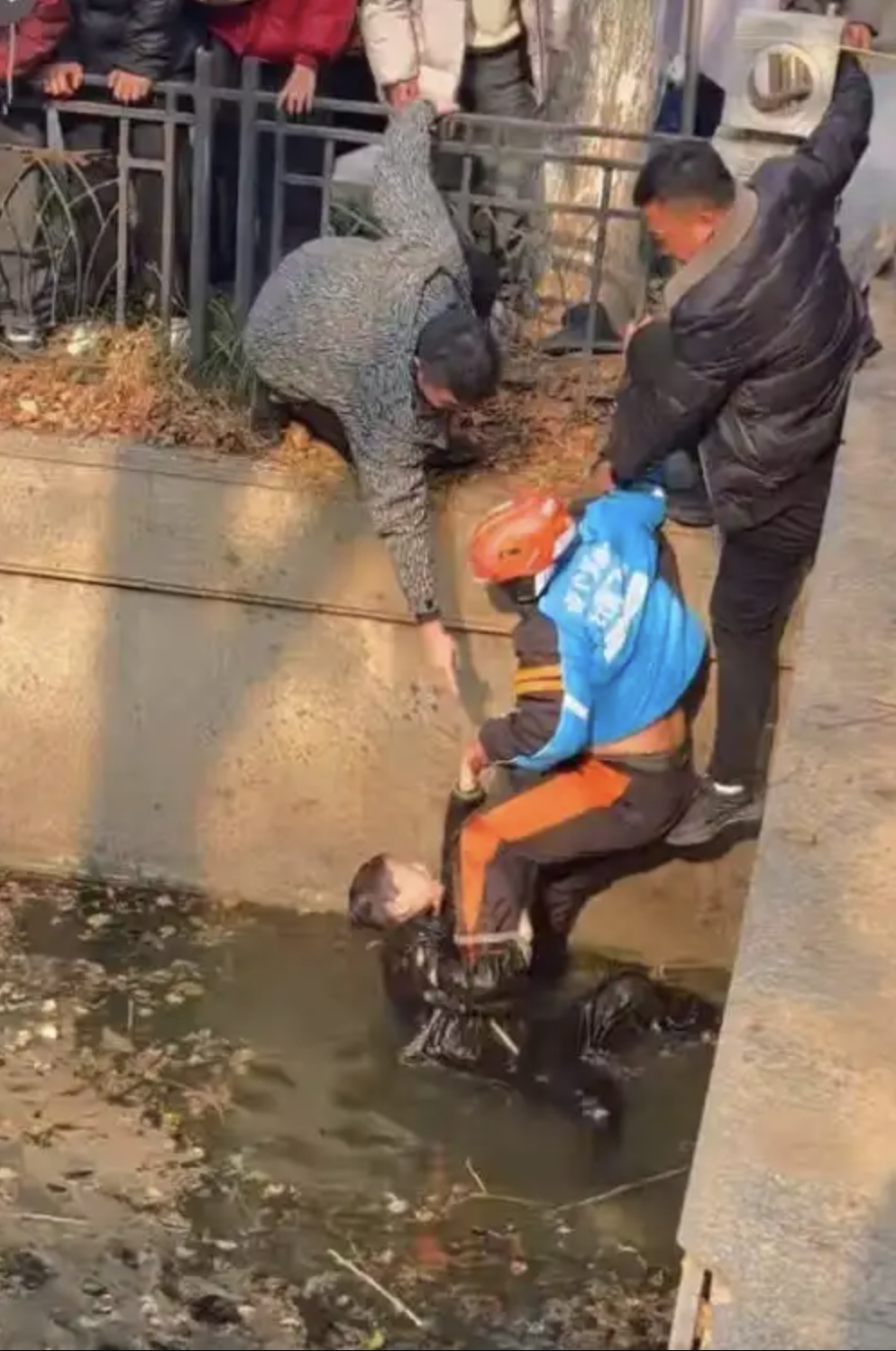 Ngay sau đó, một người đàn ông đã không ngần ngại nhảy xuống kênh, bế cậu bé lên khỏi mặt nước. Nam shipper cùng những người đứng trên bờ nhanh chóng hợp sức, kéo cả hai lên an toàn trong sự thở phào của tất cả những người có mặt.