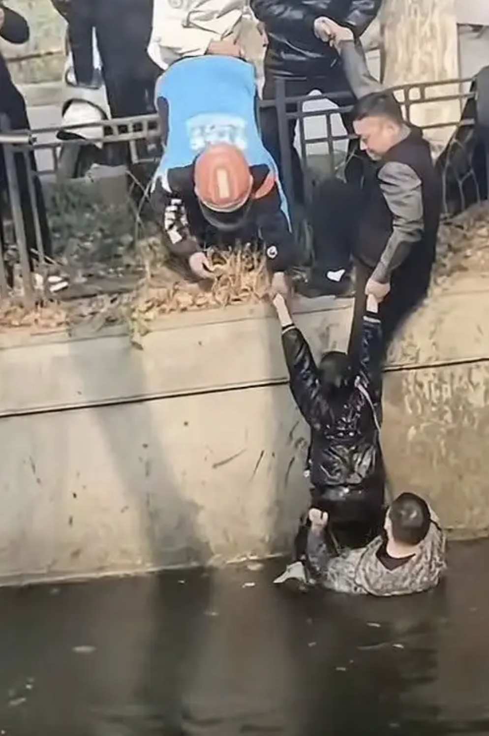 Đoạn video lan truyền trên mạng xã hội cho thấy, một bé trai mặc đồ đen đang trôi nổi dưới dòng kênh đục. Trên bờ, nam shipper mặc đồng phục giao đồ ăn cùng nhiều người dân lập tức lao vào ứng cứu. Anh bám chặt lan can, trong khi những người xung quanh giữ chặt phía sau để làm điểm tựa, rồi thò chân xuống nước, cố gắng để cậu bé bám vào. Tuy nhiên, do dòng nước và địa hình trơn trượt, việc cứu nạn gặp nhiều khó khăn.