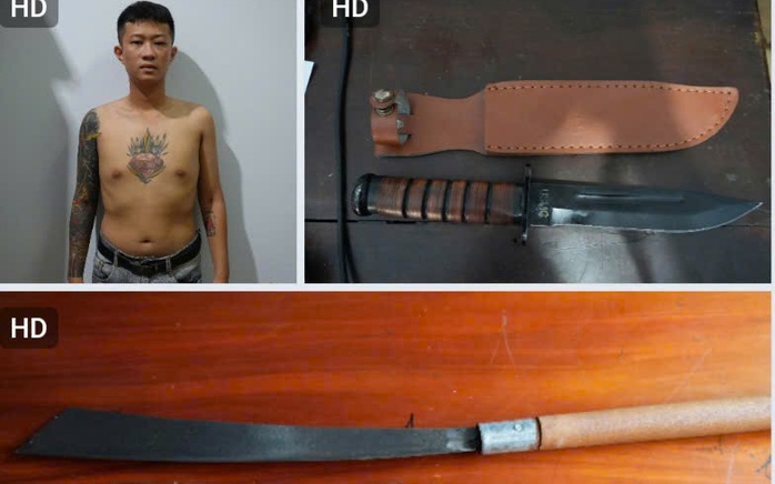 Châu Trương Minh Khoa và hung khí mà công an phát hiện, thu giữ tại nhà của Kiệt. Ảnh: Công an Bình Thuận