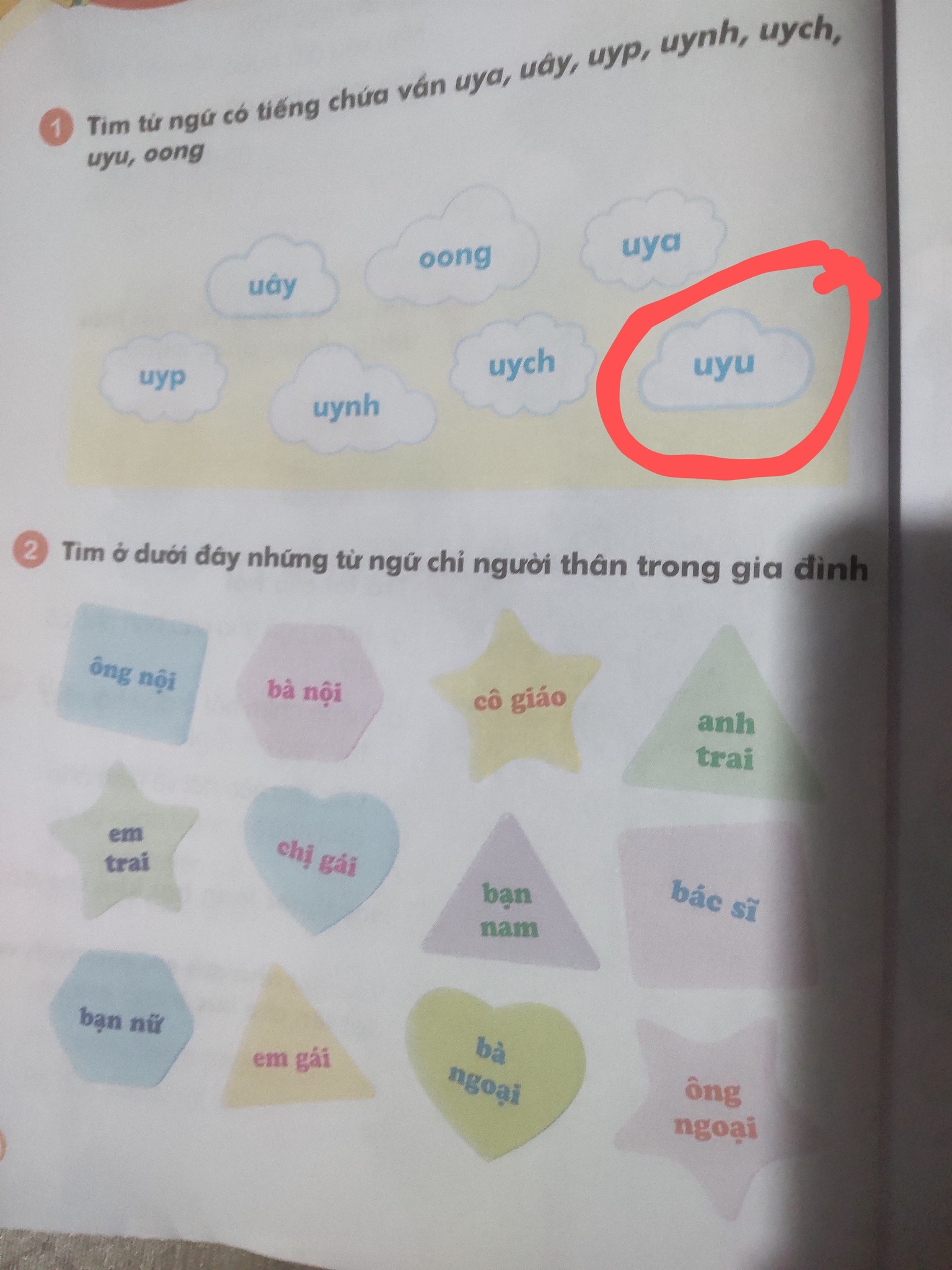 Và vần mà phụ huynh này đang không biết đọc thế nào chính là vần "uyu". Tuy nhiên, đề bài không yêu cầu học sinh đọc vần "uyu" mà là "tìm từ ngữ có tiếng chứa vần uyu", bên cạnh nhiều vần khác như "uya", "uây", "uyp", "uych", "uynh", "oong"...