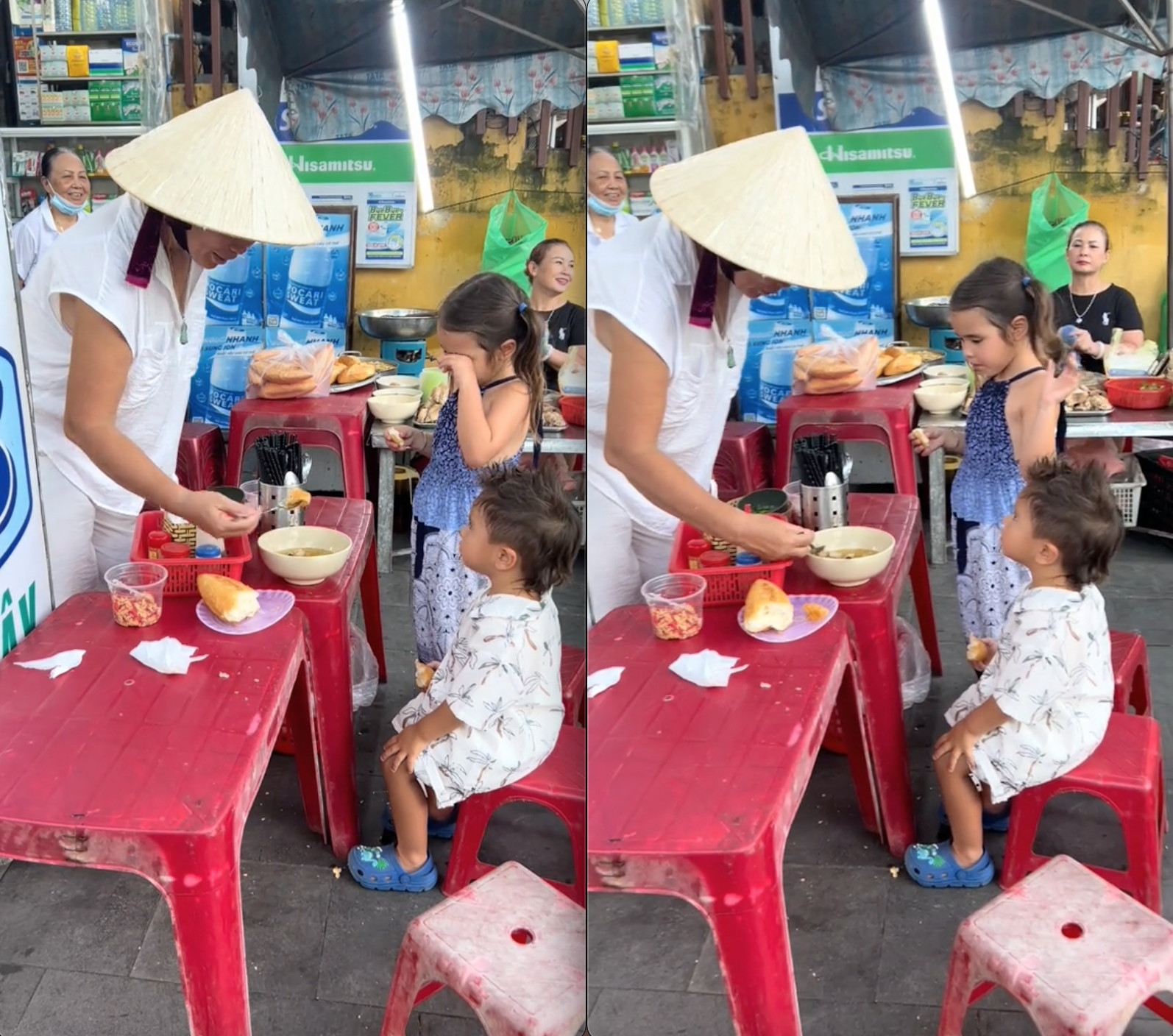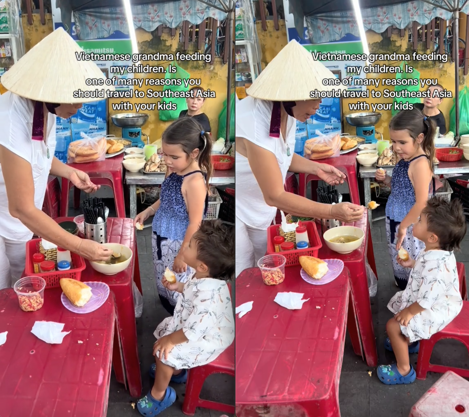 Và rồi, ai nấy đều bật cười thích thú khi nhìn lý do phía sau. Trong đoạn clip, 2 đứa con nhỏ của cô đang được một người phụ nữ Việt - trông giống chủ quán ăn - cho ăn rất tận tình. Cô ghi chú thêm: "Bà ngoại Việt Nam cho con tôi ăn. Đây là một trong những lý do bạn nên đi du lịch ở Đông Nam Á cùng những đứa con của mình."