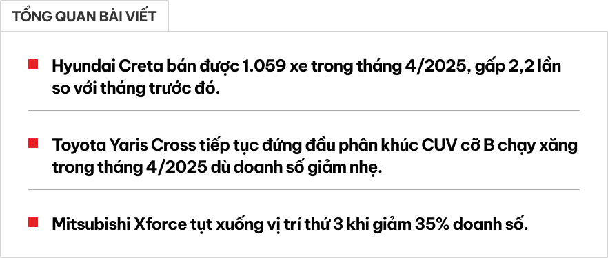 Đây là tháng đầu tiên kể từ đầu năm mẫu xe này vượt mốc 1.000 xe bán ra. Con số 1.059 chiếc cũng giúp Creta đứng thứ 8 toàn thị trường và đứng thứ 5 nếu chỉ tính các mẫu xe xăng trong tháng 4/2025.