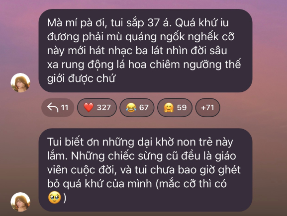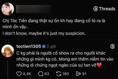 Khi một tài khoản Threads đặt câu hỏi nghi vấn liệu Tóc Tiên "đang thật sự ổn hay cố tỏ ra là mình ổn", cô đã đáp lại bằng một câu nói khiến hội chị em phải ngả mũ: "Chị không phải là người cố show ra cho người khác những gì mình không có. Mong em thêm niềm tin vào những di chứng ngọt ngào của sự tan vỡ".