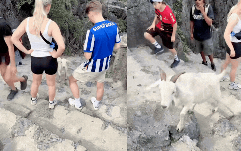 Nhưng dê núi mà lại dạn dĩ, ung dung đi dạo giữa đường dành cho người đi bộ, lại còn có thói quen "thu phí qua trạm" thì đúng là chuyện xưa nay hiếm. Thay vì hoảng sợ chạy trốn khi thấy bóng người, những chú dê ở Hang Múa lại tỏ ra vô cùng dạn dĩ và chuyên nghiệp trong vai trò "đại sứ du lịch". Chúng thong dong bước đi, thấy ai cầm theo đồ ăn, đặc biệt là trái cây ngọt thơm là xáp lại gần, nghển cổ lên nhìn chằm chằm như muốn nhắc khéo: "Phải nộp phí đường bộ rồi mới được đi tiếp nha!".