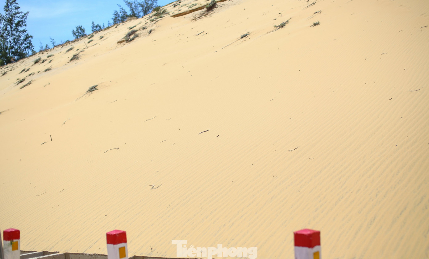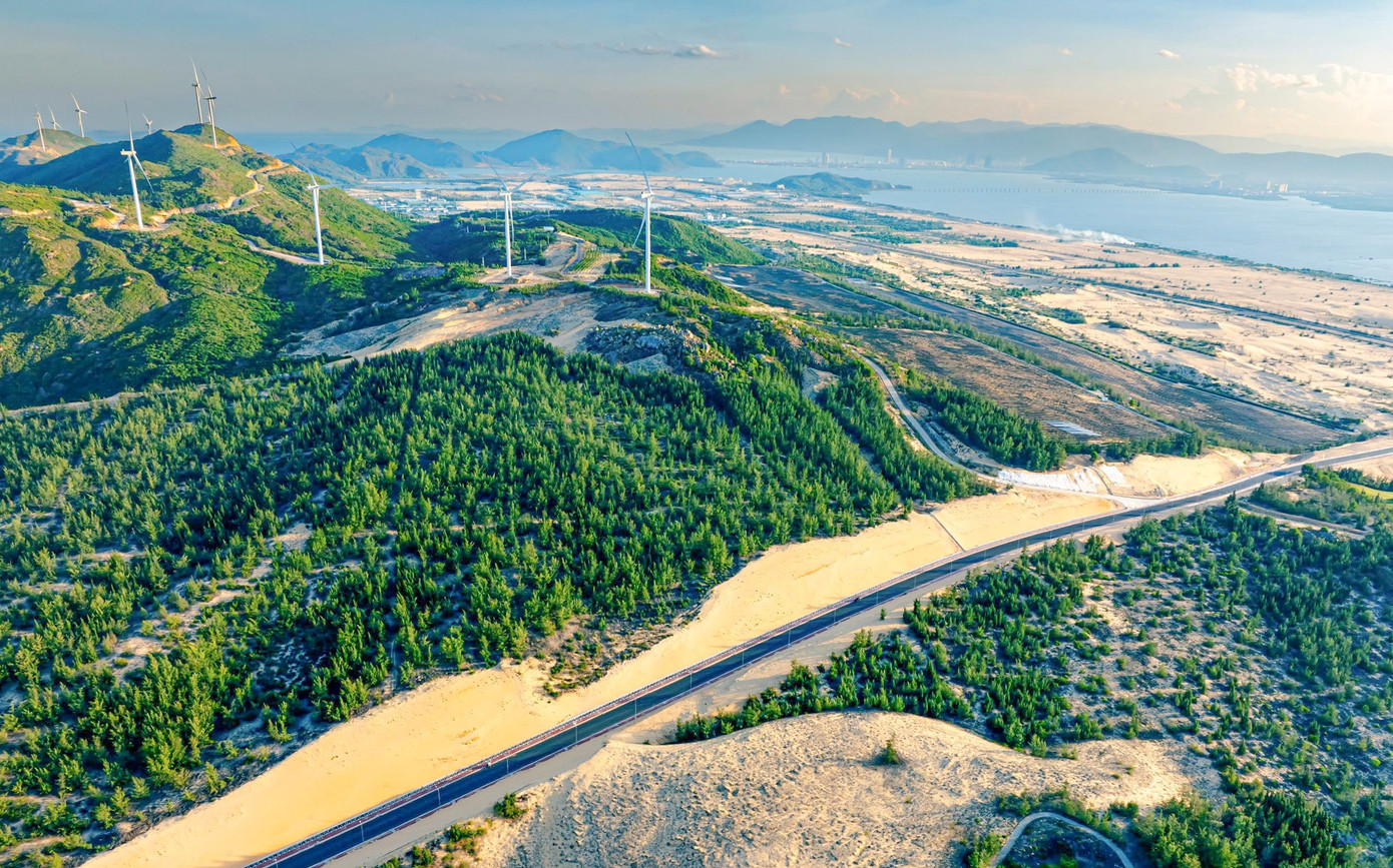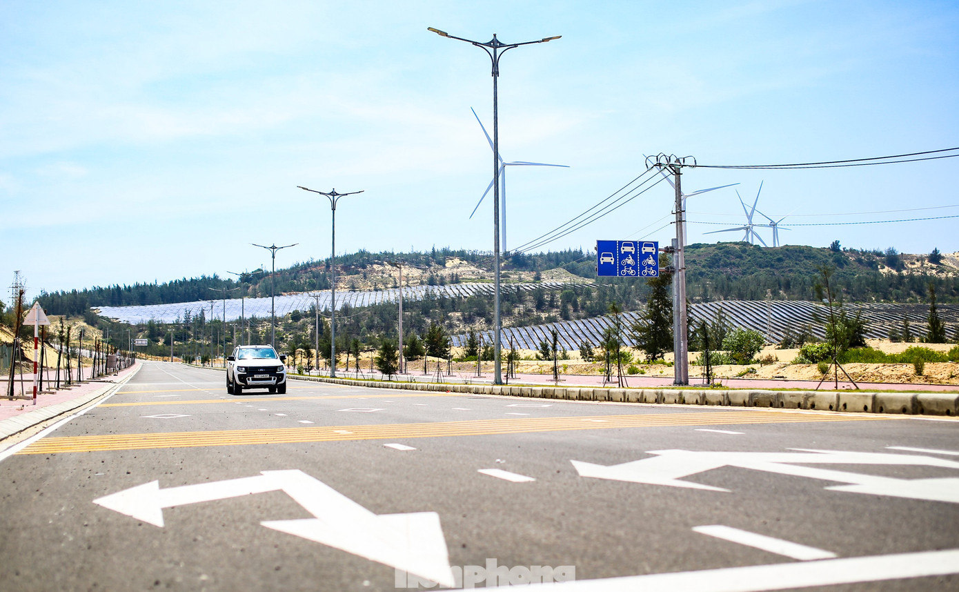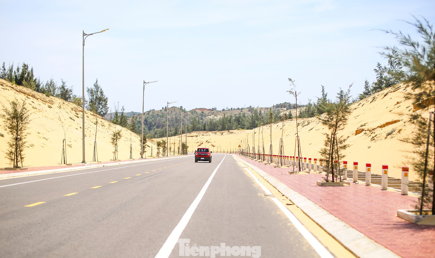 Nhìn từ trên cao, con đường hiện ra đẹp như tranh vẽ khi chạy xuyên qua những đồi cát vàng óng, dọc tuyến là màu xanh cùng những cánh rừng phi lao và những cột điện gió khổng lồ. Ảnh: Dũng Nhân