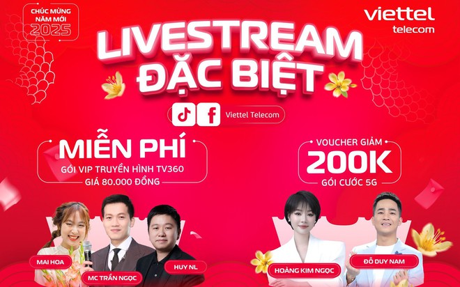 Được biết, hai phiên livestream này là một điểm nhấn nổi bật nằm trong chuỗi chương trình tri ân khách hàng Tết mới - Quà tới diễn ra xuyên Tết do Viettel triển khai. Ngoài những ưu đãi có 1-0-2 trong livestream, khách hàng của Viettel còn có cơ hội tham gia quay số trúng thưởng nhận tiền mặt với tổng giá trị lên tới 2,5 tỷ đồng khi đăng ký gói di động, internet Viettel hoặc truyền hình TV360 trong thời gian từ nay đến hết ngày 28/02/2025.