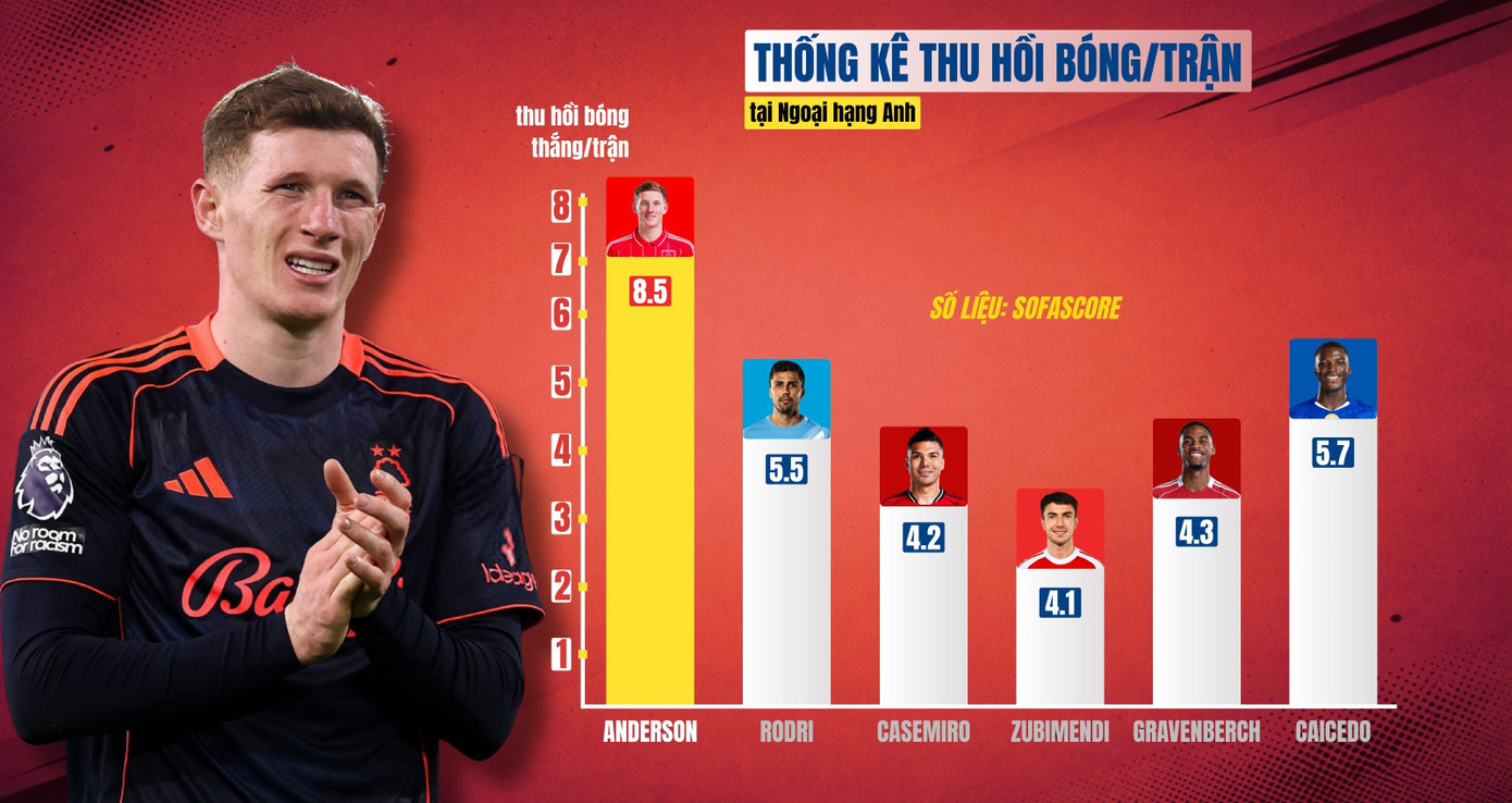 Hãy nhìn vào chỉ số phòng ngự của Anderson so với các tiền vệ hàng đầu khác, thuộc các "ông lớn" ở Ngoại hạng Anh. Ở cả 2 chỉ số quan trọng: tranh chấp tay đôi thành công và thu hồi bóng, Anderson đều dẫn đầu trong nhóm này. Tất nhiên, con số thống kê chỉ phản ánh phần nào câu chuyện, khi Nottingham thường chơi ở thế cửa dưới, Anderson phải làm nhiệm vụ phòng ngự nhiều hơn và từ đây các chỉ số trội hơn.
