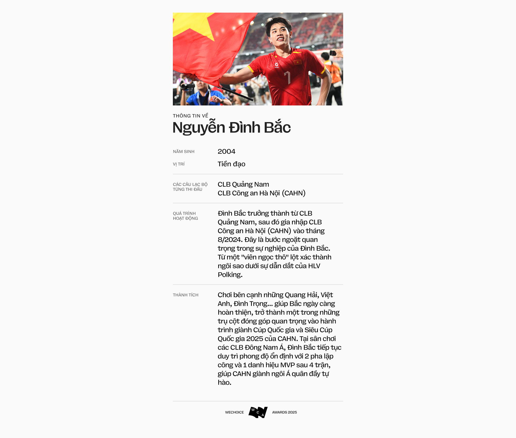 Khép lại năm 2025 bằng cú đúp danh hiệu cá nhân Cầu thủ trẻ xuất sắc nhất và Quả bóng Bạc Việt Nam ở tuổi 21. Với Đình Bắc chiến thắng lớn nhất không nằm ở chiếc cúp, nó nằm ở bản lĩnh của người đã đứng dậy sửa sai để viết tiếp giấc mơ của mình.