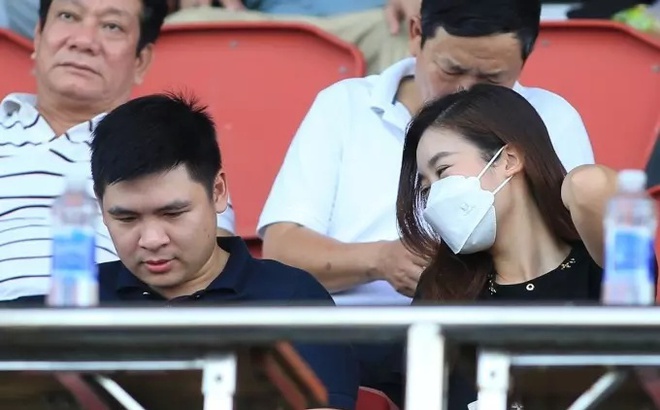 Đỗ Vinh Quang và hoa hậu Đỗ Mỹ Linh cùng theo dõi trận đấu bóng đá chiều 3/7.
