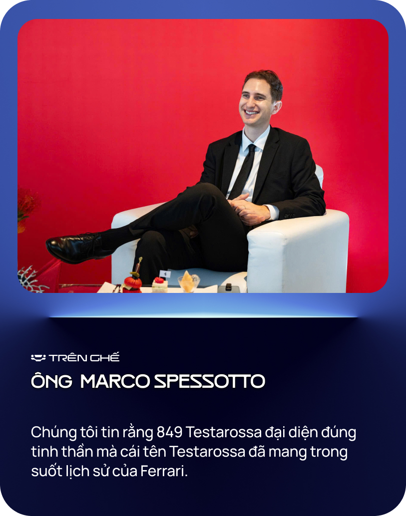 Ông Marco Spessotto: Chúng tôi tin rằng 849 Testarossa đại diện đúng tinh thần mà cái tên Testarossa đã mang trong suốt lịch sử của Ferrari. Không chỉ là các dòng xe đường phố từ sau năm 1984, mà còn là những mẫu xe đua của thập niên 50, nơi tất cả những gì Ferrari học được từ đường đua được chuyển hóa để ứng dụng lên xe thương mại trong tương lai.