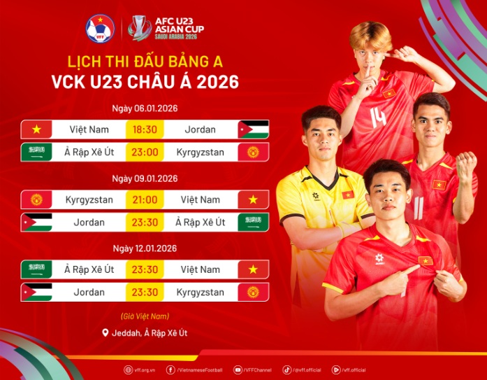 Tại giải châu Á, U23 Việt Nam sẽ lần lượt gặp Jordan (ngày 6/1), Kyrgyzstan (9/1) và chủ nhà Saudi Arabia (12/1).
