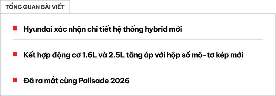 Trên Hyundai Palisade, bản 2.5L hybrid có công suất 329 mã lực, 460Nm mô-men xoắn. So với động cơ không được điện hóa, bản này có công suất tăng 19%, mô-men xoắn tăng 9%. Hiệu suất nhiên liệu xe khi được điện hóa cũng tốt hơn 45%, dù vậy mức tiêu thụ cụ thể chưa rõ.