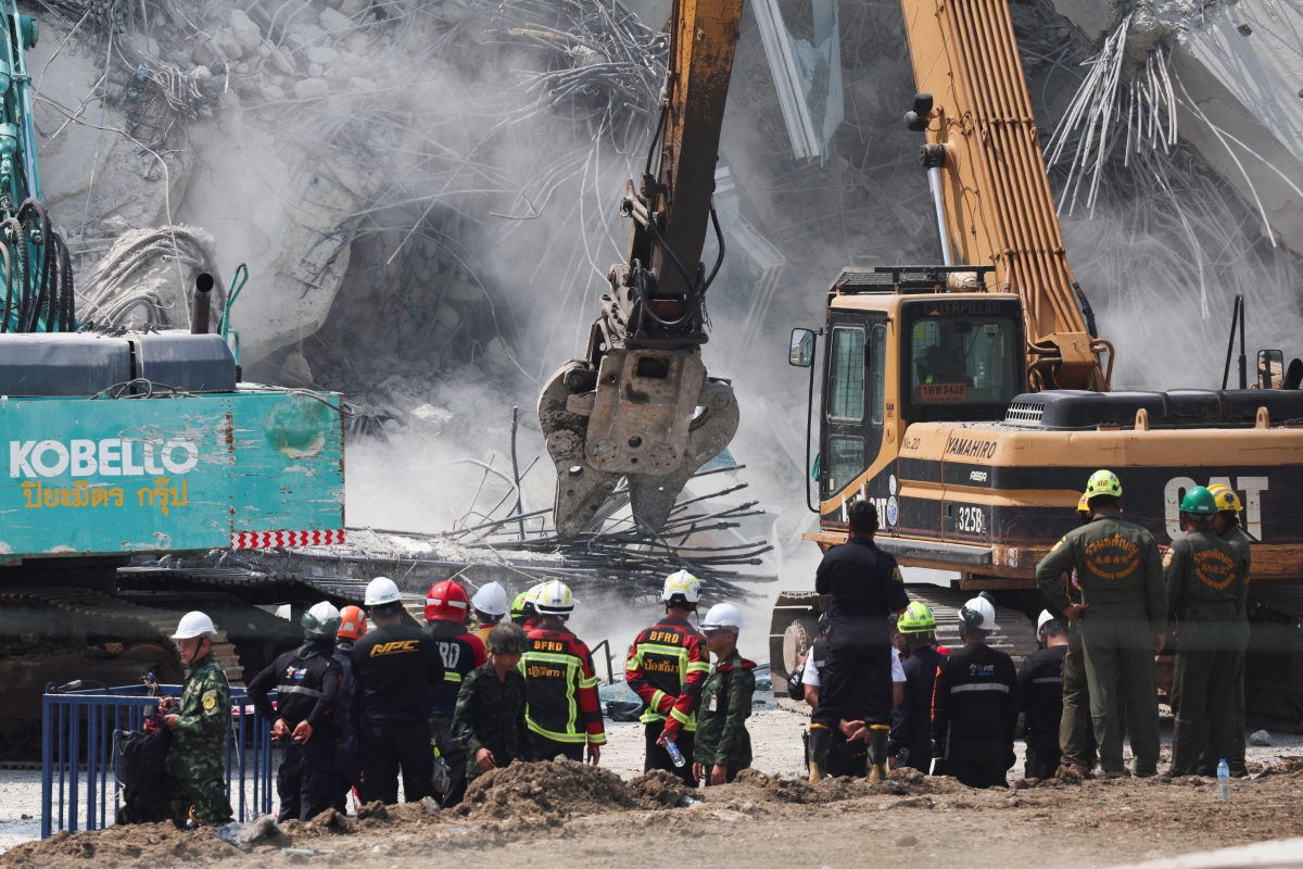 Lực lượng cứu hộ làm việc tại địa điểm xảy ra vụ sập tòa nhà cao tầng ở Bangkok, Thái Lan do động đất ở Myanmar. Ảnh: Reuters