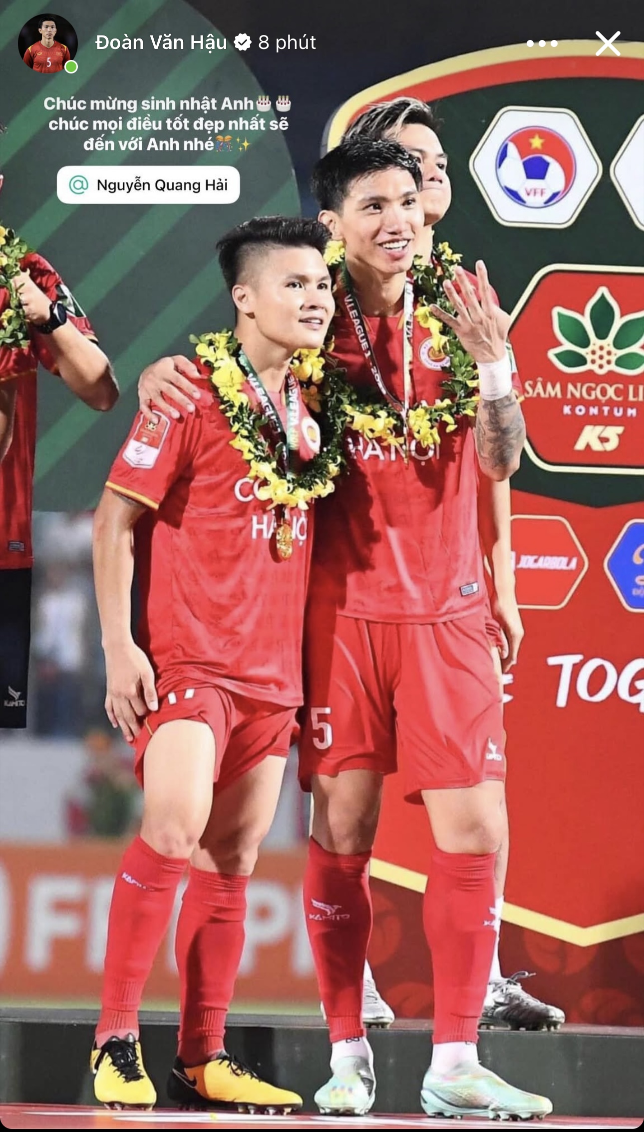 Giữa lịch trình thi đấu dày đặc và sức nóng của V.League 2025/2026, hậu vệ Đoàn Văn Hậu vẫn dành những cử chỉ ấm áp để chúc mừng sinh nhật hai người đồng đội chí cốt là Nguyễn Quang Hải và Nguyễn Văn Toàn.