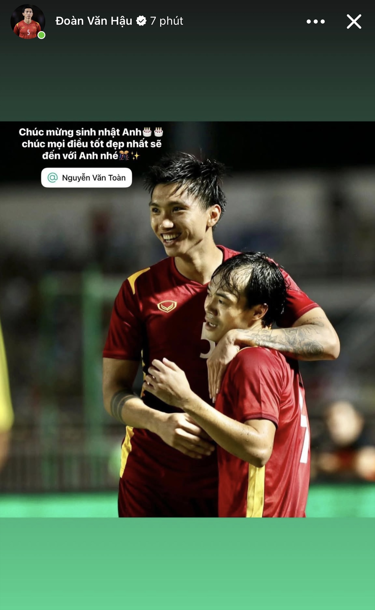 Mới đây, trên trang cá nhân, Đoàn Văn Hậu đã đăng tải loạt khoảnh khắc đầy kỷ niệm để gửi lời chúc mừng sinh nhật đến hai đàn anh thân thiết. Văn Hậu chia sẻ bức hình cùng Quang Hải rạng rỡ trên bục vinh quang trong màu áo CLB, cùng đeo huy chương và vòng hoa chiến thắng. Với Văn Toàn, hậu vệ sinh năm 1999 lại chọn một tấm hình đầy cảm xúc trong màu áo Đội tuyển Quốc gia. Khoảnh khắc hai anh em khoác vai nhau ăn mừng đã thay cho lời khẳng định về sự gắn bó bền bỉ qua nhiều thời kỳ của bóng đá Việt Nam.