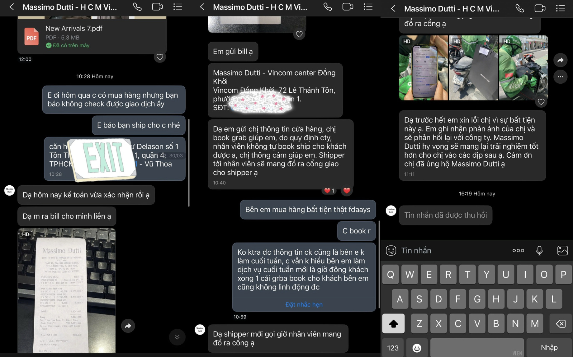 Tưởng rằng sự bất tiện này sẽ được xoa dịu vào ngày hôm sau, nhưng cách hành xử của thương hiệu được cho là đã tiếp tục dội thêm một gáo nước lạnh vào trải nghiệm của khách hàng. Sang ngày thứ Hai, theo chị Thoa không hề có một tin nhắn chủ động nào từ phía Massimo Dutti để thông báo tình trạng đơn hàng, chỉ khi khách tự mình nhắn tin hỏi trước thì mới nhận được xác nhận tiền đã vào tài khoản.