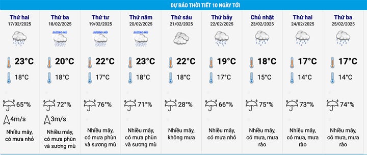 Thời tiết 10 ngày tới tại Hà Nội phổ biến có mưa, trời âm u. Cụ thể, ngày 17/2, Thủ đô nhiều mây, mưa nhỏ, nhiệt độ trong ngày dao động 18-23°C.