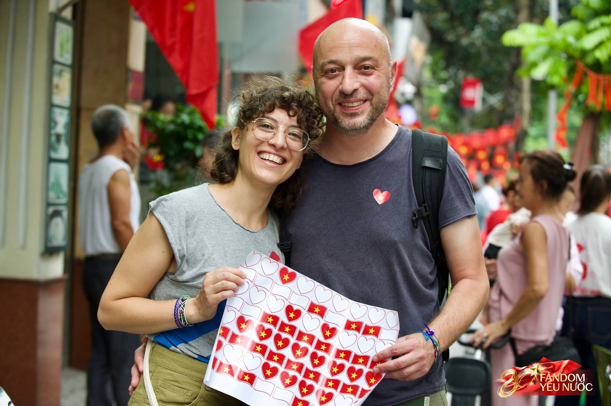 Cũng rất thích thú khi được hoà mình vào không khí rộn ràng trong những ngày này, cặp đôi người Ý - Paolo và Valentina đã nghĩ ra một cách vô cùng đặc biệt để thể hiện tình yêu với Việt Nam. Thay vì chỉ đứng xem hay chụp ảnh lưu giữ kỷ niệm, họ đã chuẩn bị sẵn những miếng dán sticker in hình lá cờ đỏ sao vàng hay trái tim đỏ sao vàng rồi tặng miễn phí cho bất kỳ ai mà họ gặp trên đường.
