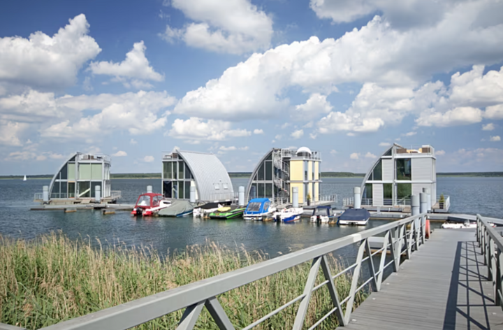 Những ngôi nhà nghỉ dưỡng nổi trên hồ Geierswald, thuộc quần thể hồ Lusatia. (Ảnh: Euronews)