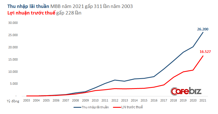 Với chiến lược cân bằng này, hoạt động kinh doanh và thu nhập lãi thuần của MBBank có những kết quả đáng kinh ngạc. Thu nhập lãi thuần năm 2021 của nhà băng này có quy mô gấp 311 lần năm 2003. Lợi nhuận trước thuế cũng gấp 228 lần so với trước đó.