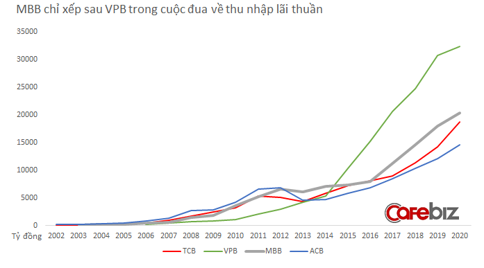 Không những vậy, MBBank nhanh chóng vượt lên Techcombank hay ACB trong cuộc đua về thu nhập lãi thuần, chỉ xếp sau VPBank.